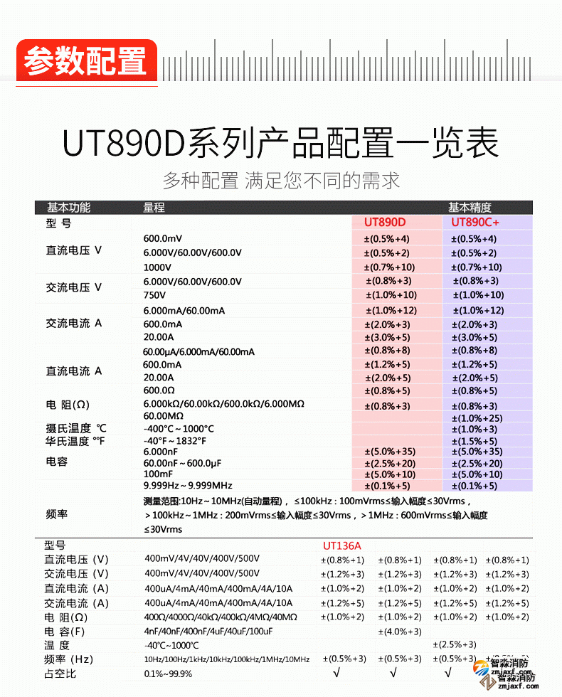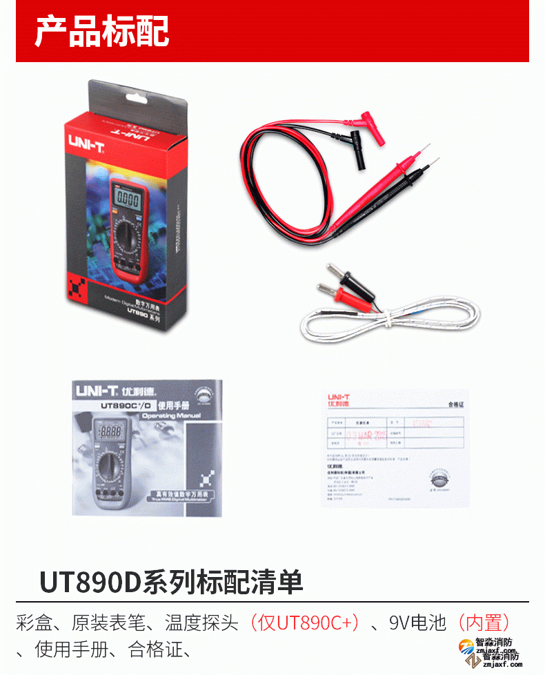 | 標準配件 | 表筆、電池、溫度探頭 (僅UT890C+) | ||